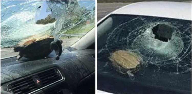 دوران سفر اچانک ایک کچھوا گاڑی کے سامنے والے شیشے (ونڈ اسکرین) کو توڑتا ہوا خاتون کے سر سے جاٹکرایا، حادثے کی وجہ سے خاتون کی آنکھ کے اوپر گہرا زخم آیا تاہم 71 سالہ خاتون کی حالت خطرے سے باہر ہے۔