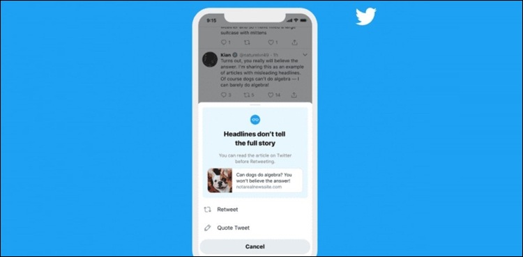 فیچر متعارف ہونے کے بعد جب صارف کسی آرٹیکل کو بنا پڑھے ری ٹویٹ کرے گا تو اُس کے سامنے ایک پیغام آئے گا۔ اس پاپ اپ مسیج میں لکھا ہوگا کہ ’ہیڈ لائن مکمل کہانی بیان نہیں کرتی‘۔