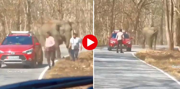 بھارت کے باندی پورا نیشنل پارک میں سیاح جیسے ہی سیلفی بنانے کے لیے گاڑی سے اترے تو ہاتھی ان کے پیچھے لگ گیا جس کے بعد سیاحوں کی دوڑیں لگ گئیں۔