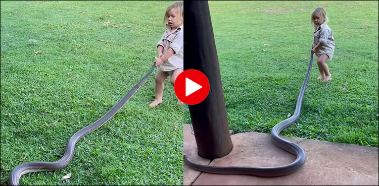 ویڈیو میں دیکھا جاسکتا ہے کہ چھوٹا بچہ بلا کسی خوف کے لان میں سانپ کو دم سے پکڑ کر کھینچ رہا ہے۔
