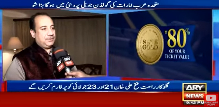 اے آر وائی نیوز کے مطابق متحدہ عرب امارات کی گولڈن جوبلی پردبئی میں بڑے میوزیکل شو کا انعقاد کیا جائے گا، جس میں راحت فتح علی خان سمیت دیگر گلوکار اپنے آواز کا جادو جگائیں گے۔
