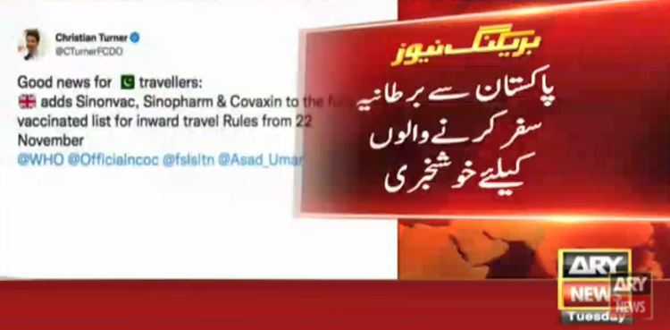 پاکستان میں تعینات برطانوی ہائی کمشنر کرسچن ٹرنر نے ٹویٹ میں بتایا کہ بائیس نومبرسےسائنوویک، سائنو فارم کو بھی تسلیم کیا جائے گا۔