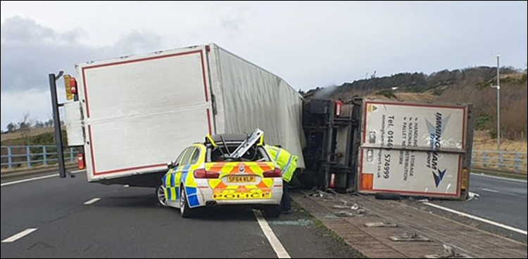 غیرملکی خبررساں ادارے کی رپورٹ کے مطابق برطانیہ میں تیز ہوائیں چلنے کے نتیجے میں ٹرک پولیس کار پر الٹ گیا، اس صورت حال کے سبب ٹریفک کی روانی متاثر ہوئی اور نظام زندگی درہم برہم ہوگیا۔
