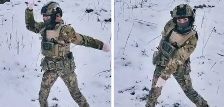 ویڈیو میں دیکھا جا سکتا ہے کہ یوکرینی فوجی اپنی مکمل وردی، لوہے کی ٹوپی، بلٹ پروف جیکٹ، بوٹس اور ناجانے کس کس سامانِ حرب سے لیس ہے تاہم وہ میدان جنگ میں فوجی پوزیشن لینے کے بجائے رقص کرنے میں مصروف ہے۔