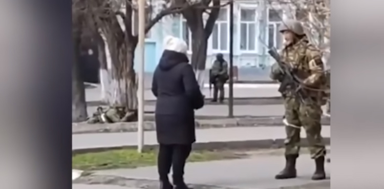 یوٹیوب پر اپلوڈ کی گئی ویڈیو میں دیکھا جا سکتا ہے کہ یوکرینی خاتون روسی فوجی سے سخت لہجے میں بات کر رہی ہیں۔ وہ فوجی سے کہا رہی ہیں کہ ”تم کون ہو اور ہماری سرزمین پر کیا رہے ہو“۔