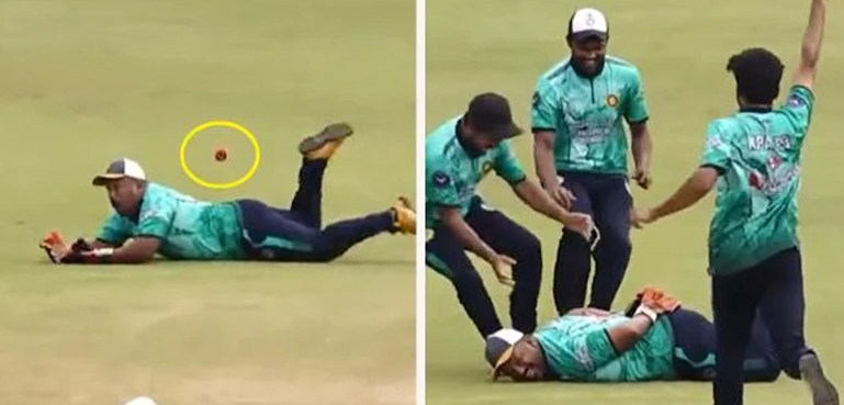 اس ویڈیو میں دیکھا جا سکتا ہے کہ وکٹ کیپر کیچ پکڑنے کےلیے چھلانگ لگاتا ہے، لیکن گیند اسکے گلوز میں نہیں آتی۔ اس کوشش میں وہ گر جاتا ہے لیکن دلچسپ بات یہ ہے کہ گیند زمین پر گرنے کے بجائے وکٹ کیپر کی کمر پر چلی جاتی ہے۔