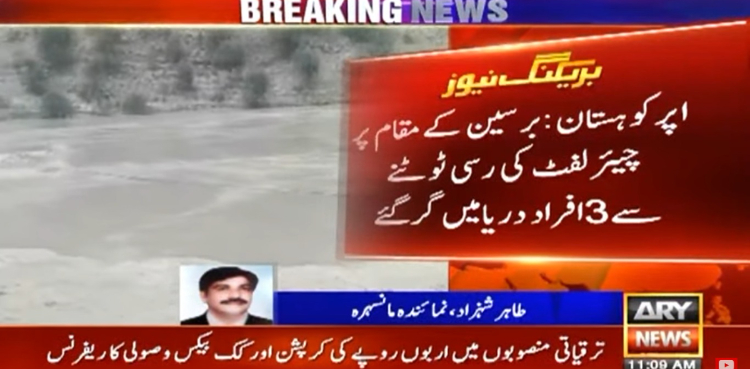 اپرکوہستان: برسین کے مقام پر چیئر لفٹ کی رسی ٹوٹنے سے 3 افراد دریا میں گر گئے۔