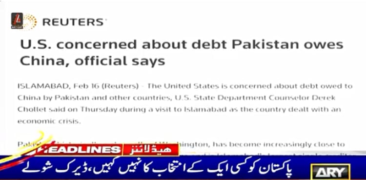 تفصیلات کے مطابق امریکی محکمہ خارجہ کے قونصلر ڈیرک شولے نے دورہ اسلام آبادکے دوران رائٹرز سے گفتگو میں کہا کہ امریکا کو پاکستان پر چین اور دوسرے ملکوں کے واجب الادا قرضوں پر تشویش ہے۔