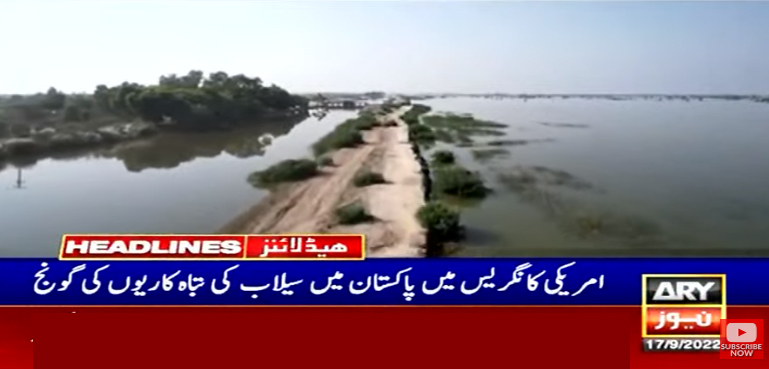 اے آر وائی نیوز کے مطابق امریکی کانگریس میں بھی پاکستان میں سیلاب کی تباہ کاریوں کی داستان پہنچ گئی ہے اور رکن کانگریس نے شرکا کو تصاویر کی مدد سے سیلاب سے بڑے پیمانے پر ہونے والے جانی اور مالی نقصانات سے آگاہ کیا۔