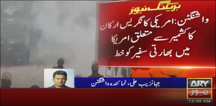 نمائندہ اے آر وائی نیوزجہانزیب علی کے مطابق امریکی کانگریس اراکین کی جانب سے بھیجے گئے خط میں بھارتی سفیر سے سوال کیا گیا ہے کہ کشمیر سے متعلق فراہم کردہ بھارت کی معلومات شواہد سے مختلف ہے۔