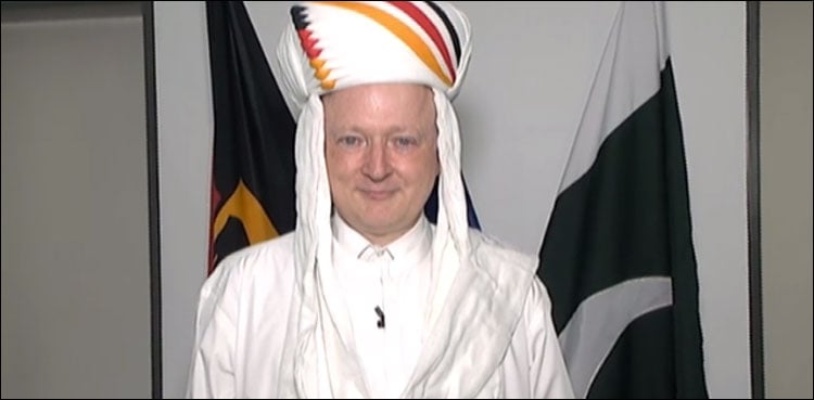 جرمن قونصل جنرل ڈاکٹر روڈیگر لوٹز کو جرمن پرچم کے رنگوں سے مزین بلوچی پگ پہنائی گئی تھی۔