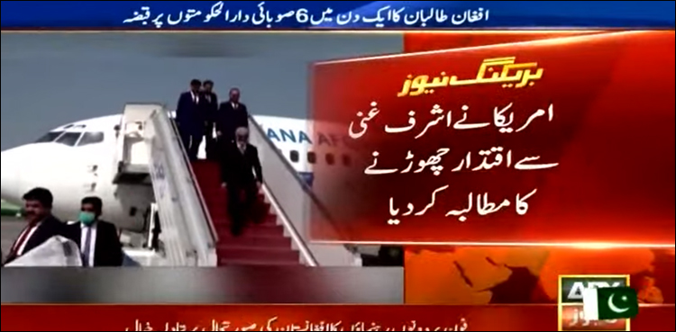 ذرائع کا دعویٰ ہے کہ امریکا کی جانب سے اشرف غنی سے اقتدار چھوڑنے کا مطالبہ کیا گیا ہے، امریکا نے کہا کہ سیز فائر کے لیے ضروری ہے کہ اشرف غنی اقتدار سے الگ ہو جائیں اور عبوری حکومت کا قیام عمل میں لایا جائے۔