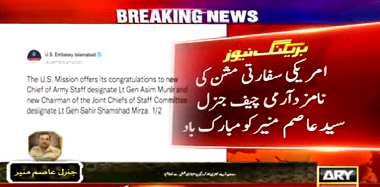 تفصیلات کے مطابق امریکی سفارتی مشن نے نامزد آرمی چیف جنرل سیدعاصم منیر اور نامزد سی جے سی ایس سی جنرل ساحر شمشاد مرزا کو مبارک باد دی۔
