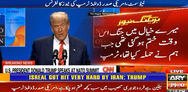 امریکی صدر ڈونلڈ ٹرمپ نے نیٹوسمٹ کے موقع پر نیوز کانفرنس کرتے ہوئے کہا کہ جیسے ہیروشیما و ناگاساکی کے بعد جنگ رکی، ویسا ہی ایران کے ساتھ ہوا، ایران پر امریکی حملے نے بڑے تصادم کو روکا، نیٹو اتحادیوں کو بہترین کانفرنس پر مبارکباد دیتا ہوں۔