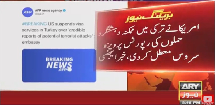 فرانسیسی خبررساں اداے کی رپورٹ کے مطابق امریکا نے ترکی میں ممکنہ دہشت گردحملوں کی رپورٹس کے پیش نظر ویزہ سروس کو عارضی طور پر معطل کردیا۔