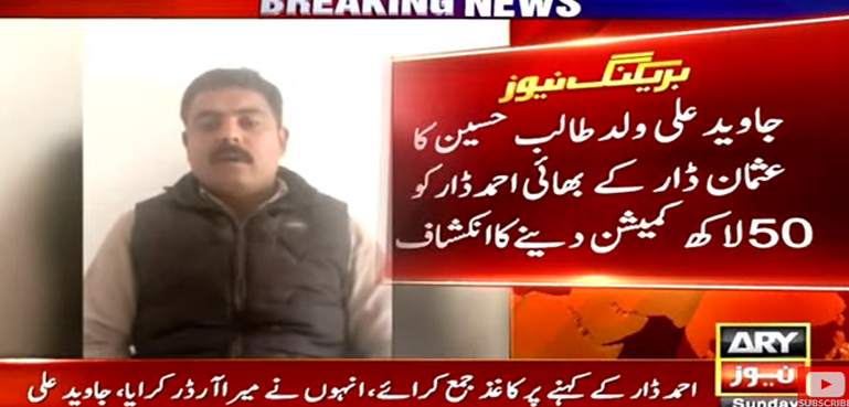 جاوید علی نے بیان دیتے ہوئے کہا کہ وہ 3 ماہ عثمان ڈار کا ڈیولپمنٹ کے لئے پی اے تھا۔ باجوہ اینڈ کمپنی کو 2 کروڑ کا ٹھیکہ ملا ، 20 لاکھ کمیشن احمد ڈار کو دیا۔ زین باجوہ کمپنی کے پاس 50 لاکھ کا ٹینڈرتھا، 5 لاکھ کمیشن احمد ڈار کو دیا۔ خضر کنسٹرکشن کے پاس ایک کروڑ کا ٹینڈر تھا جس میں سے 10 لاکھ کا کمیشن لے کر احمد ڈار کو پہنچایا۔