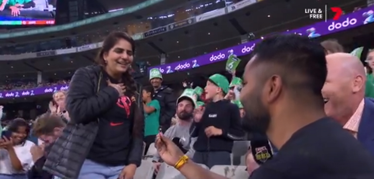 آسٹریلیا میں کھیلی جا رہی بگ بیش لیگ کے ایک میچ کے دوران اس وقت دلچسپ واقعہ پیش آیا جب ایک بھارتی نوجوان نے اپنی گرل فرینڈ کو شادی کیلیے پرپوز کر دیا۔