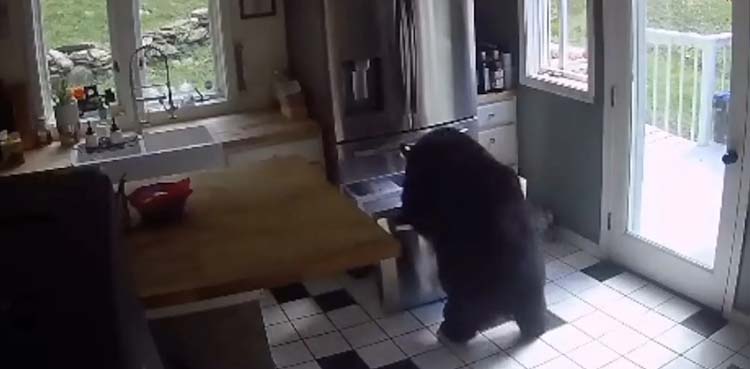سوشل میڈیا پر ایک کالے بھالو کی ویڈیو وائرل ہورہی ہے جس میں دیکھا جاسکتا ہے کہ بھالو کھانے کی تلاش میں مزے سے ٹہلتا ہوا گھر میں داخل ہوتا ہے اور پھر پورے گھر کا معائنہ کرنے کے بعد کچن میں پہنچتا ہے۔