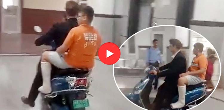 ویڈیو میں دیکھا جاسکتا ہے کہ مذکورہ شخص بیٹے کو بٹھا کر اسپتال کی تیسری منزل پر موٹر سائیکل کو لفٹ کے ذریعے نیچے اتار رہا ہے۔