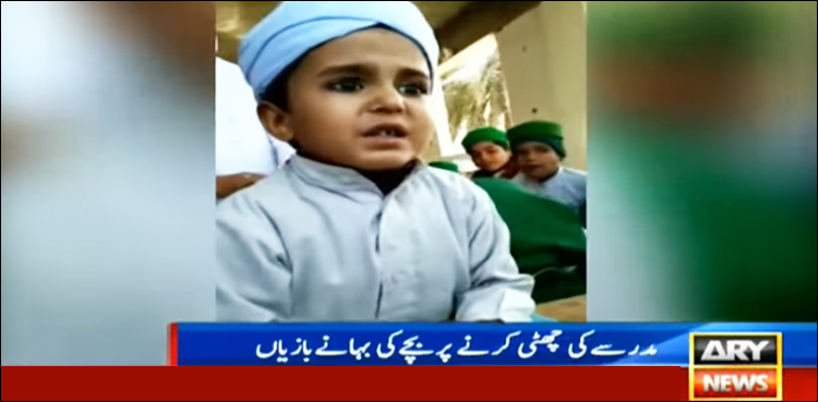 تفصیلات کے مطابق مدرسے میں چھٹی کرتے ہیں تو بچوں کو قاری کی جانب سے سزا دی جاتی ہے ایسے میں بچے مختلف بہانے بناتے ہیں لیکن اس معصوم بچے کی بہانے بازی کی ویڈیو سوشل میڈیا پر وائرل ہوگئی۔