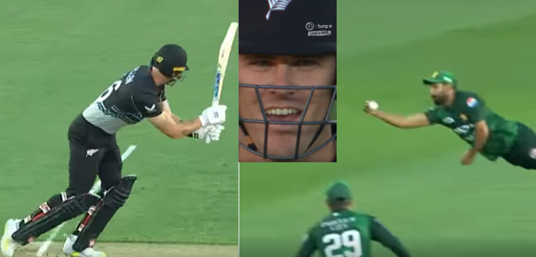 نیوزی لینڈ اننگ کے پہلے اوور میں شاہین شاہ آفریدی کے پہلے اوور کی پانچویں گیند پر کیوی اوپنر فن ایلن نے لیگ سائیڈ پر زور دار شاٹ مارا تاہم حارث رؤف راہ میں آ گئے۔