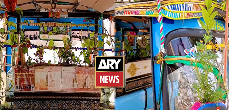 موسمیاتی تبدیلیوں کے باعث اب ہر ایک کو پودے اور درخت لگانے کی ترغیب دی جا رہی ہے مگر ایک شخص سالوں سے اصلی پودوں سے سجا رکشا چلا رہا ہے۔