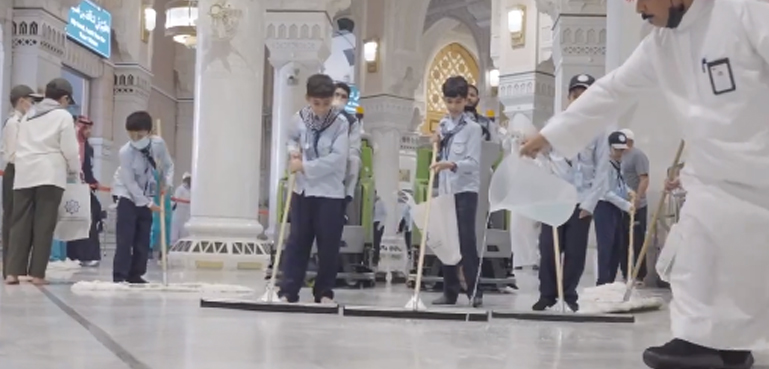 اس حوالے سے حرمین شریفین کے نگراں اعلی ادارے نے سوشل میڈیا اکاؤنٹ پر ایک ویڈیو شیئر کی ہے جس میں اسکول کے کمسن طلبہ کو مسجد الحرام کا صحن دھوتے ہوئے اور مختلف مقامات پر قرآن پاک اور دینی کتابوں کے شیلف کی صفائی کرتے ہوئے بھی دیکھا جا سکتا ہے۔