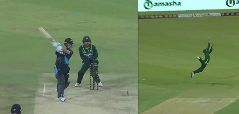 اس موقع پر وہاں فیلڈنگ کرنے والے شاداب خان فوری حرکت میں آئے اور فضا میں اچھل کر نا قابل یقین کیچ لے کر کیوی بیٹر کو 8 رنز پر ہی چلتا کیا۔