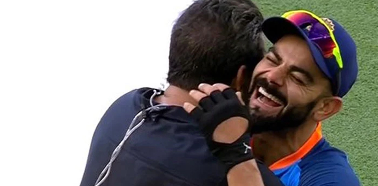 بھارتی اسٹار کھلاڑی نے گلے ملنے کے بعد سابق کپتان سے ہاتھ بھی ملایا۔