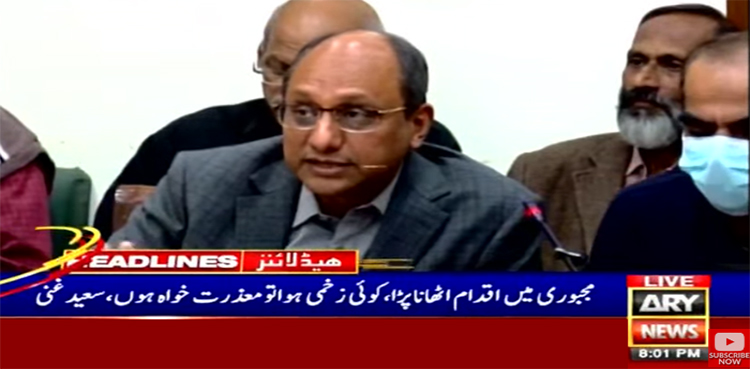 سعیدغنی نے کہا کہ جماعت اسلامی کادھرنابھی جاری ہےان پرتشددنہیں کیاگیا، ایم کیوایم کوکہا وزیراعلیٰ ہاؤس کے سامنے آپ کا احتجاج ریکارڈ ہو گیا اب آپ پریس کلب چلےجائیں لیکن وہ نہیں گئے ہمیں مجبوری میں اقدام اٹھانا پڑا، کوئی زخمی ہواتومعذرت خواہ ہوں۔