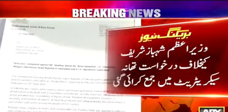 وزیراعظم شہبازشریف کیخلاف درخواست تھانہ سیکریٹریٹ میں جمع کرائی گئی ، جس میں راناثنا اللہ ،آئی جی اسلام آباد ودیگر حکام کیخلاف بھی کارروائی کی استدعا کی گئی ہے۔