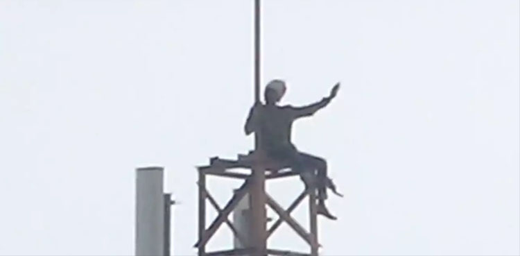 تصویر میں دیکھا جاسکتا ہے کہ مبینہ طور پر نشے میں دھت شخص جالنا ضلع میں 100 فٹ کے موبائل فون ٹاور پر بیٹھا ہے۔