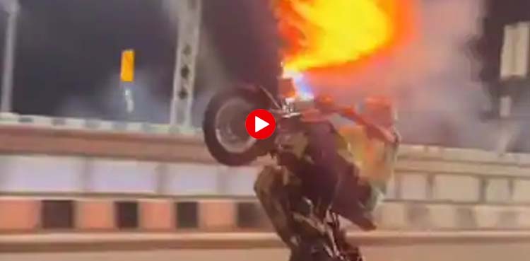 ویڈیو میں اس شخص کو اپنی موٹر سائیکل پر پٹاخے لگاتے اور پھر سڑک پر ون ویلنگ کرتے ہوئے انہیں آگ لگاتے ہوئے دیکھا جاسکتا ہے۔