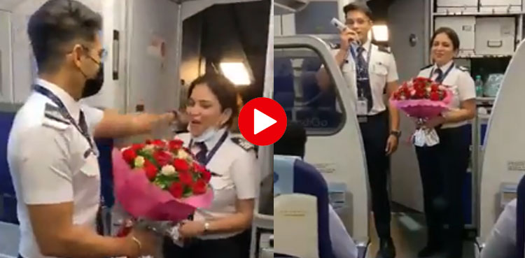 ویڈیو میں امن ٹھاکر نامی 24 سالہ پائلٹ ہاتھ میں گلدستہ لیے طیارے میں داخل ہوتے ہوئے ساتھی پائلٹ کی طرف بڑھتے ہوئے دکھائی دے رہے ہیں جو کوئی اور نہیں بلکہ ان والدہ ہیں۔