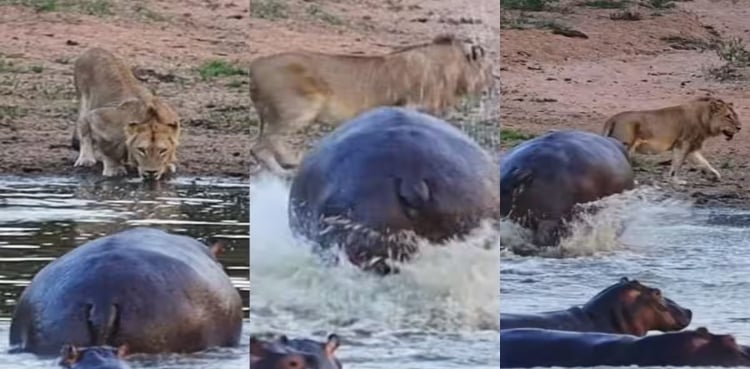 تاہم شیر کو اکثر ‘جنگل کا بادشاہ’ کہا جاتا ہے لیکن جنوبی افریقہ کے ریزرو کی یہ تازہ ترین وائرل ویڈیو کچھ اور ہی کہہ رہی ہے، اس سنسنی خیز ویڈیو میں ایک دریائی گھوڑا شیر کو ڈراتے ہوئے دیکھایا گیا ہے جو جھیل سے پانی پی رہا تھا۔
