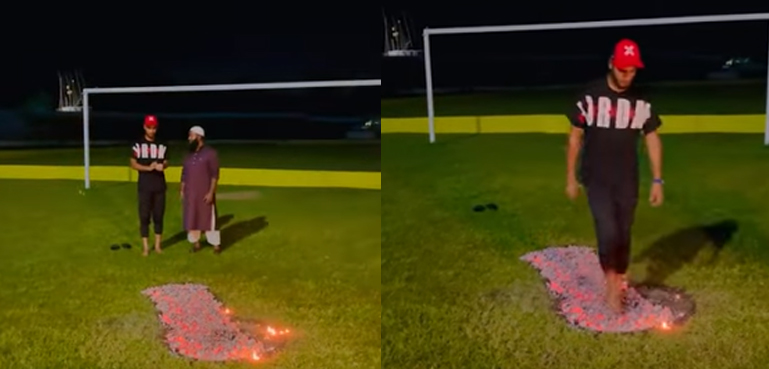 سوشل میڈیا پر ویڈیو وائرل ہو رہی ہے جس میں بنگلہ دیش کرکٹ ٹیم کے معروف بیٹر محمد نعیم شیخ کو ایک گراؤنڈ مشہور مائنڈ ٹرینر سبط ریحان کے کہنے پر دہکتے ہوئے کوئلوں پر ننگے پیر چلتے ہوئے دیکھا جا رہا ہے۔