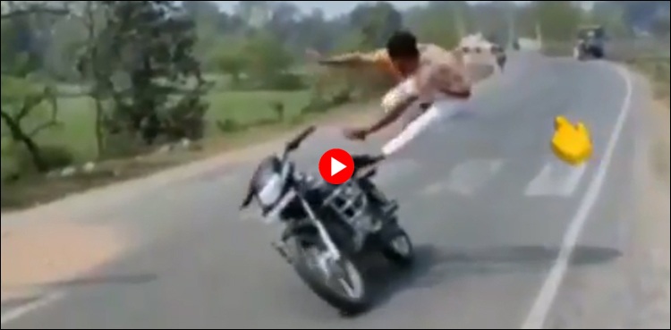 ویڈیو میں دیکھا جاسکتا ہے کہ نوجوان نے چلتی موٹرسائیکل پر کھڑے ہونے کی کوشش کی تو وہ توازن برقرار نہ رکھ سکا۔
