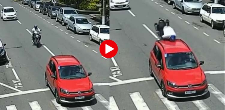 ویڈیو میں دیکھا جاسکتا ہے کہ خوش قسمتی سے موٹر سائیکل سوار بچ گیا تاہم گاڑی کی ون شیلڈ ٹوٹ گئی۔
