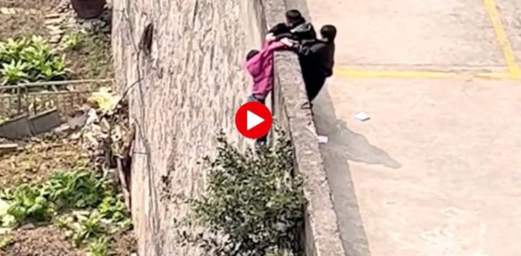 رپورٹ کے مطابق جنوب مغربی چین کی چونگ کنگ میونسپلٹی میں کار پارکنگ کے کنارے پر کمسن بچی پھسل کر دیوار پر لٹک گئی تھی جس کے بعد بچوں نے فوراً ہی اسے بازو سے پکڑ لیا۔