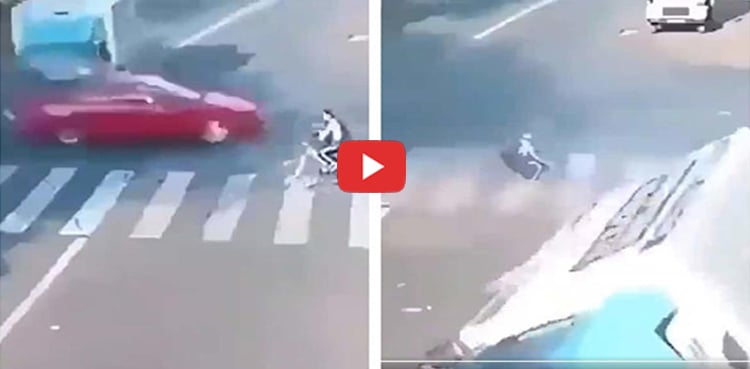 ویڈیو میں دیکھا جا سکتا ہے کہ سائیکل پر سوار شخص کار اور ٹرک میں تصادم کے نتیجے میں جان لیوا حادثے میں بال بال بچ گیا۔