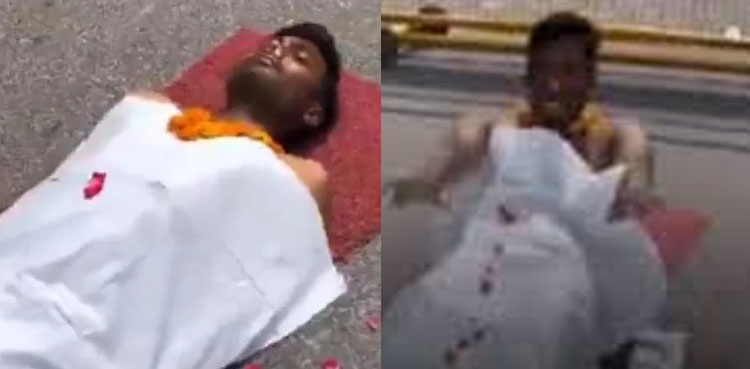 وائرل ویڈیو میں دکھایا گیا ہے کہ مکیش کمار نامی شخص سڑک پر سفید چادر، نتھنوں میں روئی اور گلے میں پھولوں کے ہار ڈالے مرنے کا ڈرامہ رچا رہا ہے۔