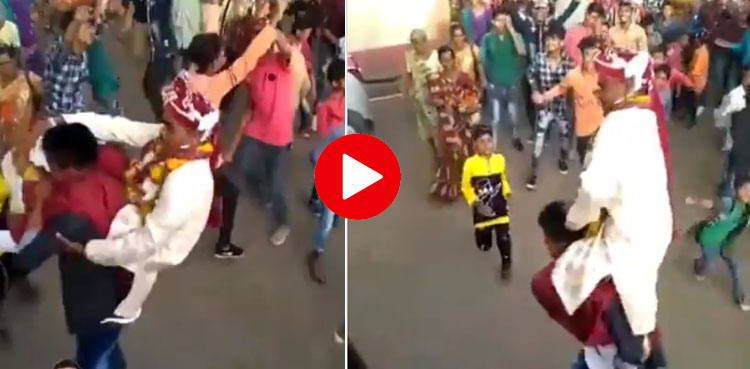 ایسی ہی ایک ویڈیو بھارت سے سامنے آئی ہے جس میں بارات کے دوران دوست کے کندھے پر چڑھنے والا دلہا دھڑام سے نیچے گر گیا۔