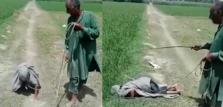 یہ شرمناک ویڈیو سوشل میڈیا پر وائرل ہوگئی جس میں دیکھا جا سکتا ہے کہ دولت اور طاقت کے نشے میں چور زمیندار ایک غریب مزدور کے گلے میں رسی ڈال کر اسے کتے کی طرح چاروں ہاتھوں اور پاؤں سے چلنے پر مجبور کرتا ہے۔