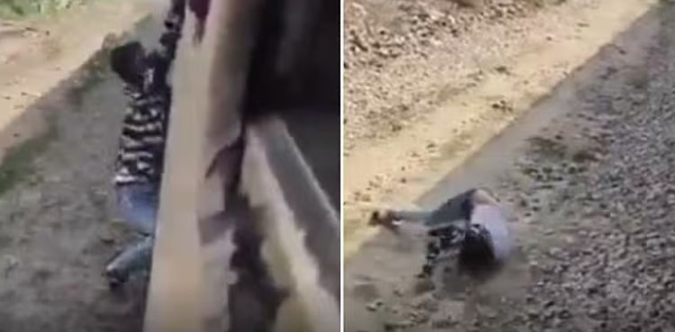 وائرل ویڈیو میں دیکھا جاسکتا ہے کہ لڑکا ٹرین کی کھڑکی سے لٹکا ہوا ہے جبکہ اور خطرناک طریقے سے لٹک رہا ہے، چند لمحوں کے بعد ٹرین کی رفتار آہستہ ہوجاتی ہے اور وہ پٹریوں پر گرجاتا ہے۔