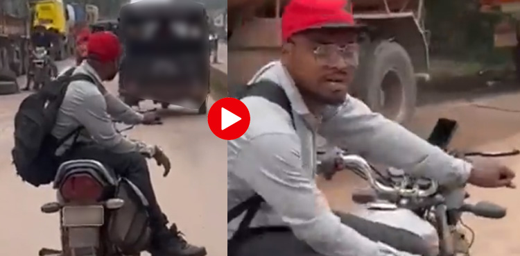 وائرل ویڈیو میں دیکھا جا سکتا ہے کہ نوجوان اپنی دونوں ٹانگیں ایک طرف رکھ کر مصروف سڑک پر بائیک کو صرف ایک ہاتھ سے سنبھال رہا ہے۔
