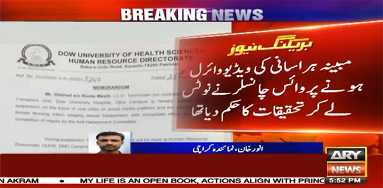 ڈاؤ یونیورسٹی اسپتال کے ہیومن ریسورس ڈائریکٹریٹ نے مبینہ ہراساں کرنے والے ہیڈ نرس کو معطل کر نوٹیفکیشن جاری کر دیا۔