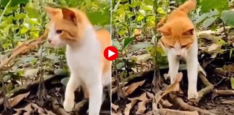 ویڈیو میں دیکھا جاسکتا ہے کہ سانپ بلی کے قریب آکر اسے ڈسنے کی کوشش کرتا ہے جسے دیکھ کر لگتا ہے کہ وہ بلی کو ڈس لے گا۔