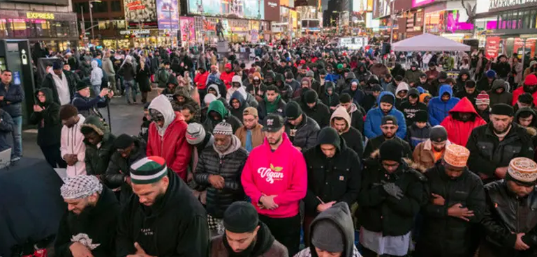 ٹائمز اسکوائر پر نمازِ تروایح کی ادائیگی کی ویڈیوز سوشل میڈیا پر وائرل ہو رہی ہیں۔ ان ویڈیوز میں مسلمانوں کی بڑی تعداد کو باجماعت نماز ادا کرتے دیکھا جا سکتا ہے۔