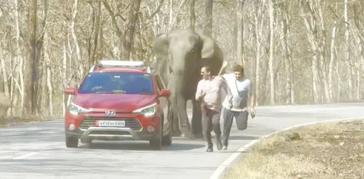 دونوں افراد جیسے ہی قریب پہنچے تو اچانک ہاتھی ان کی طرف لپکا اور ان کے پیچھے دوڑ پڑا۔ اس ویڈیو کو دوسری کار میں بیٹھے شخص نے فلمایا ہے۔
