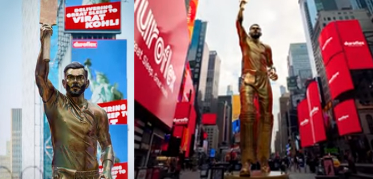 جی ہاں ٹائمز اسکوائر پر ویرات کوہلی کا جگمگاتا سنہری مجسمہ ان کا نہیں بلکہ کمپیوٹر ٹیکنالوجی سے بنایا گیا جعلی مجسمہ ہے جو ایک گدا ساز کمپنی نے اپنی تشہیر کے لیے بنایا ہے۔